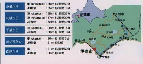 | 北海道の南西部、函館市と札幌市の中間に位置する伊達市。南は噴火湾として知られている内浦湾に面し、 その東は工業都市室蘭市と観光都市登別市があります。 さらに北及び西には噴煙たなびく有珠山、昭和新山をはさんで国立公園ゾーン内にある蛇田町、に隣接している。 |