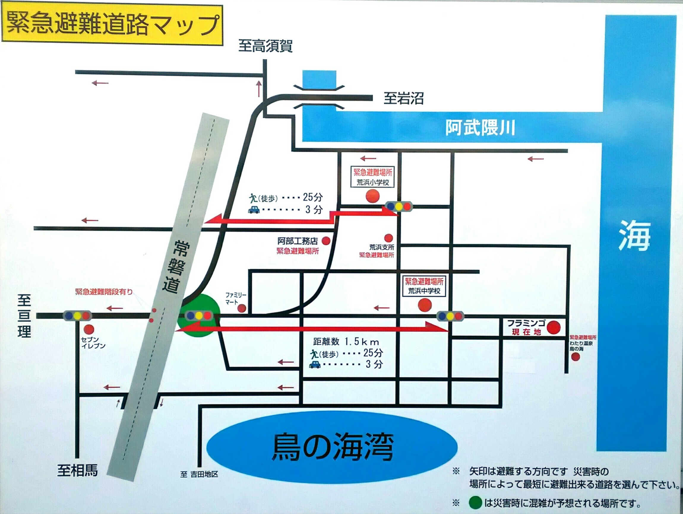 防災部会では荒浜地区の緊急避難道路マップを作成しました。 平成30年にかけ新避難道路を建設しており一部見直ししています。 この避難道路マップは荒浜の中心街や鳥の海ふれあい市場や商店街に掲示しております。